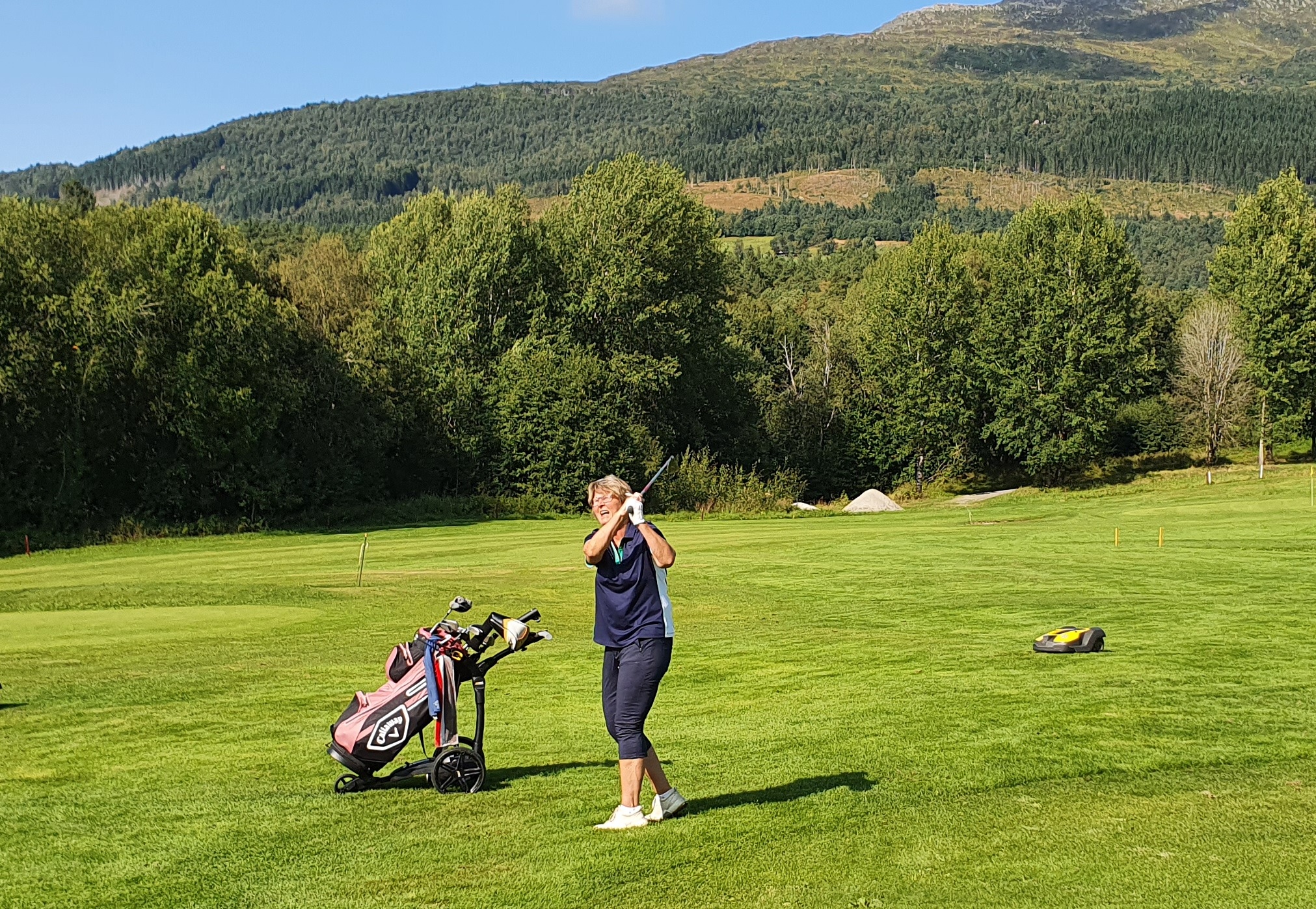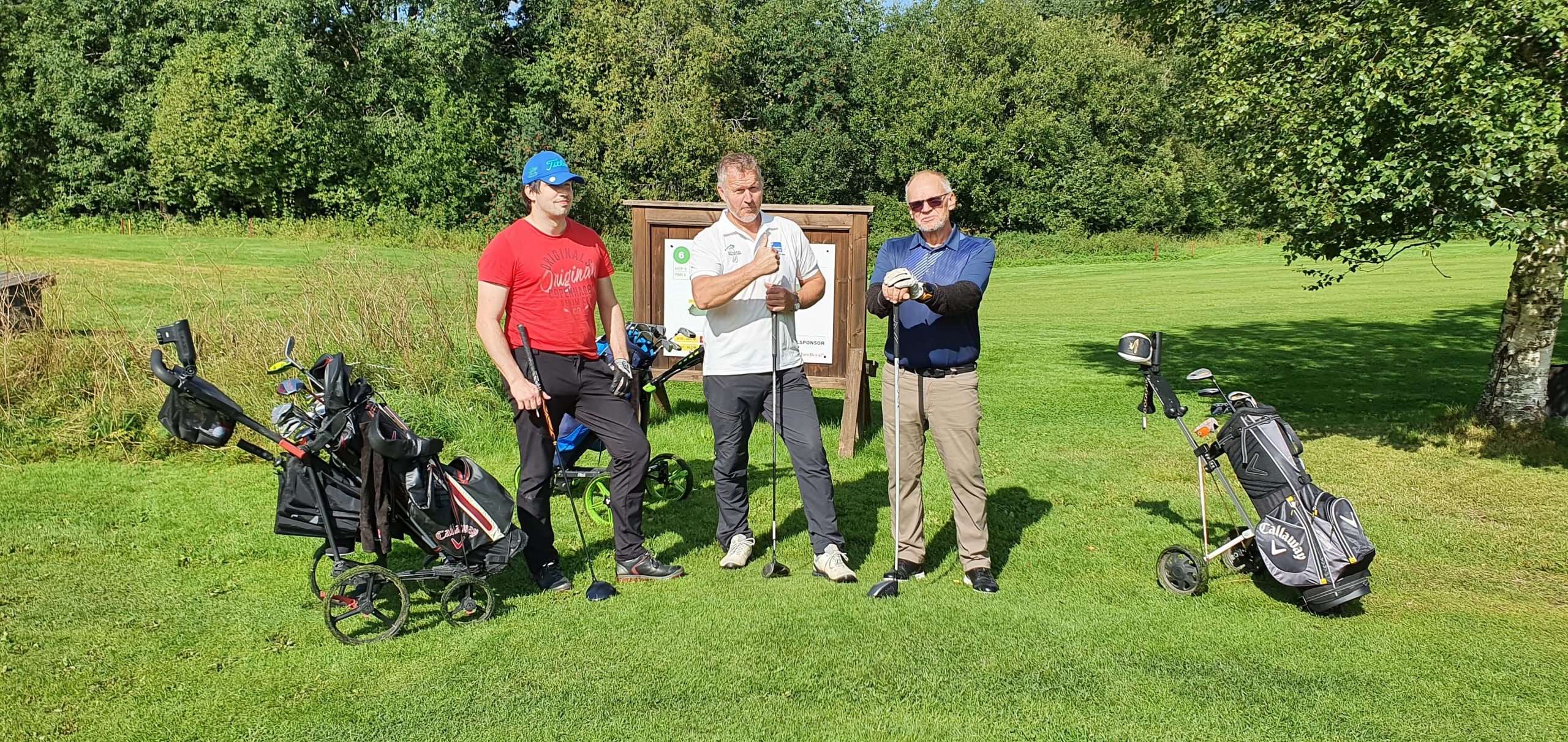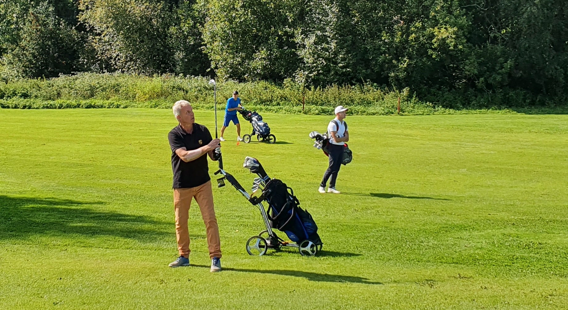 Bjørn Schei gjennomførte et sterkt klubbmesterskap, og endte på 3. plass i klassen «Herrer senior» og 4. plass totalt. Magnus Snekvik og Torstein Snekvik følger med når Bjørn slår inn mot greenen på hull 13.