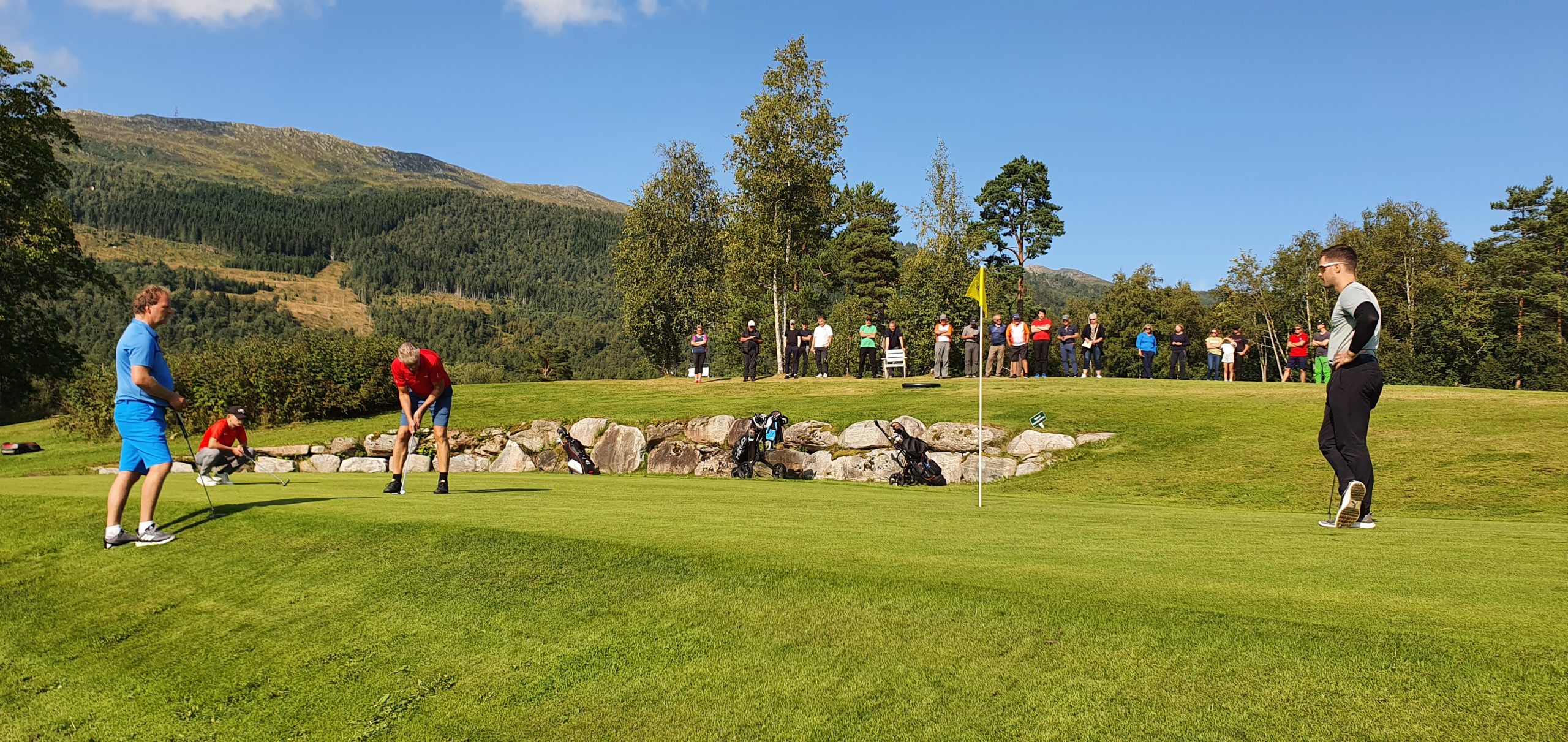 Her er de 4 beste herrespillerne på hull 16. Geir Garte putter, mens medspillerne/konkurrentene Allan Troelsen, Marius Kvande og Stian Kooyman følger spent med. Siste del av klubbmesterskapet ble spilt i strålende sol og god sommertemperatur. Og som vi ser bak var det en god del publikum som fulgte med avslutningen av klubbmesterskapet.