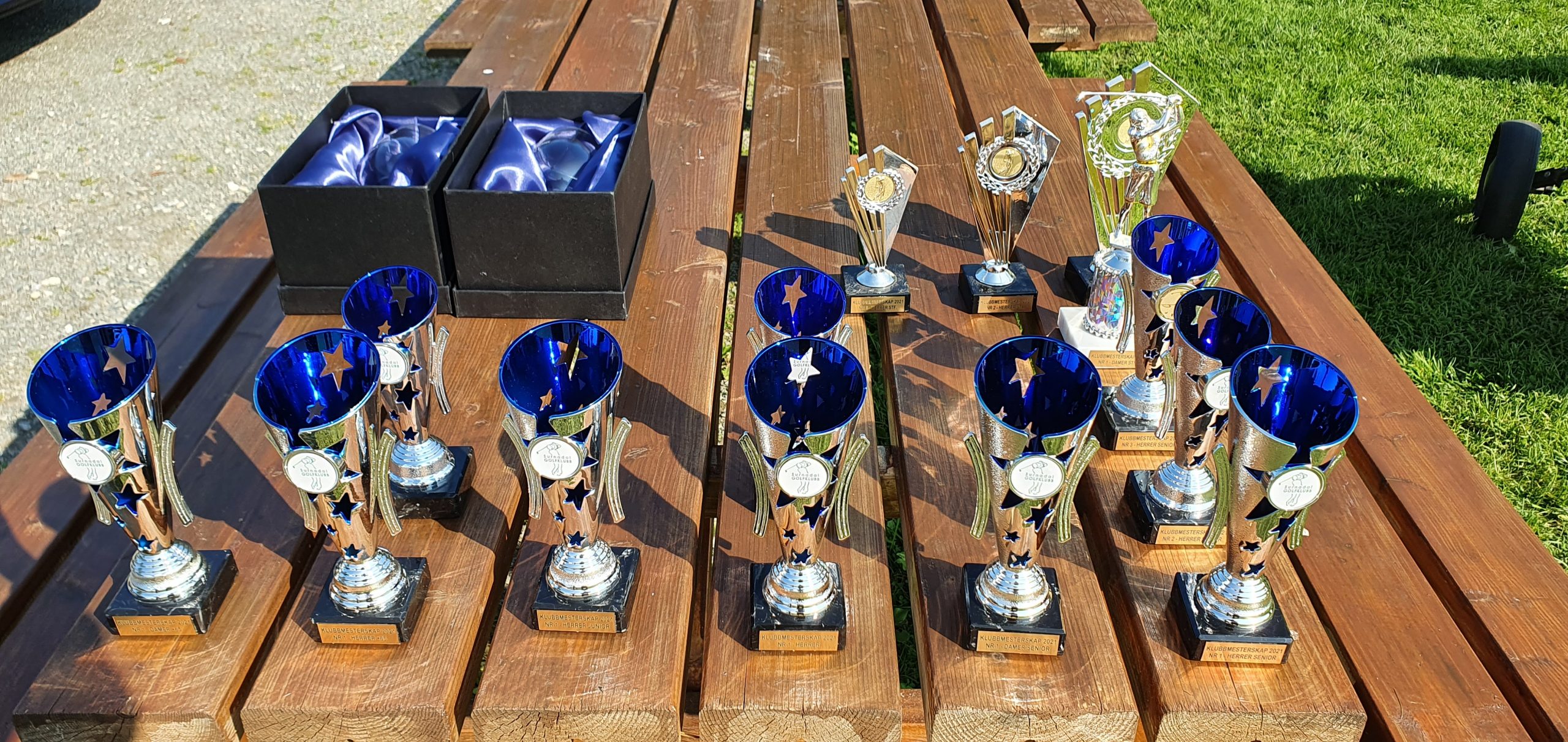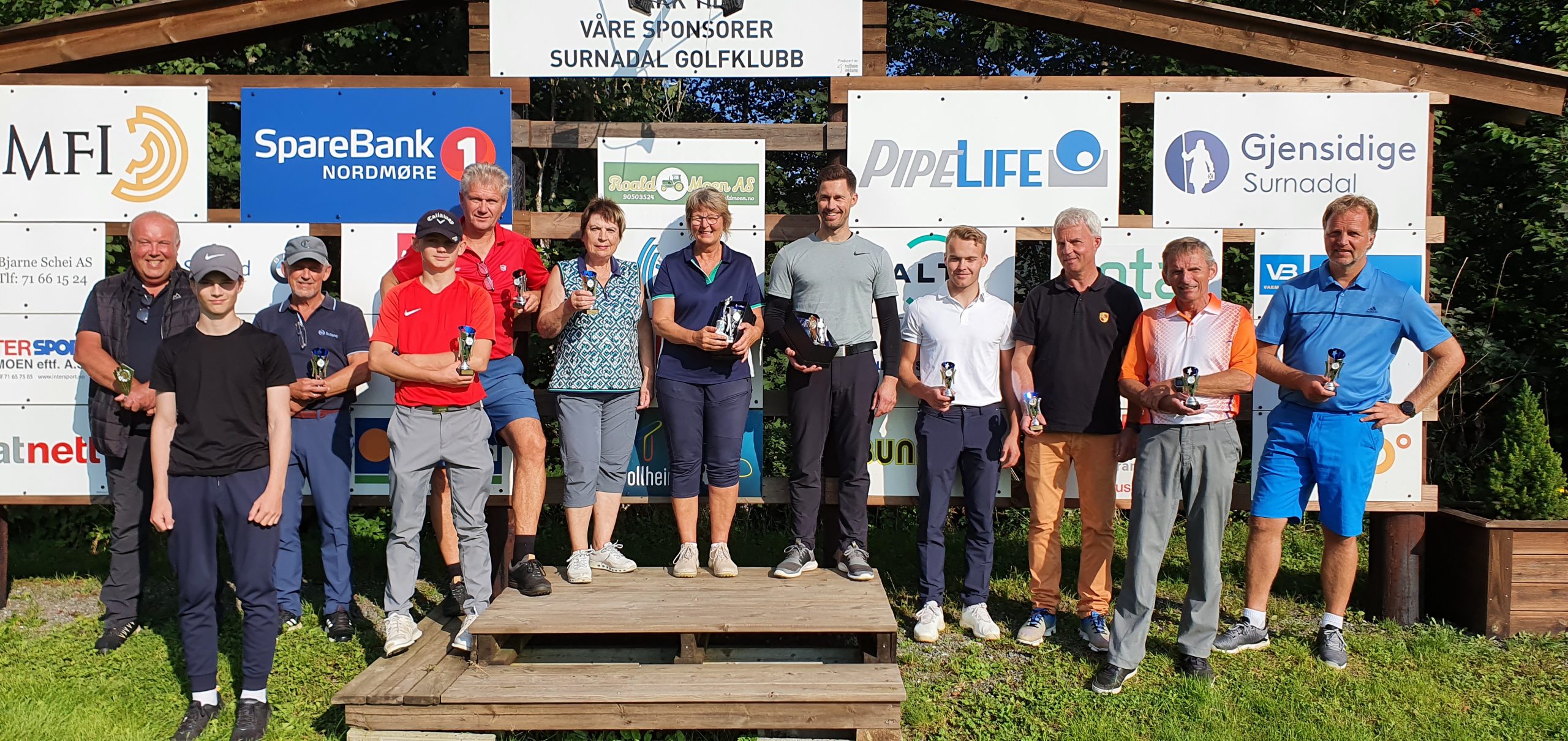 I klubbmesterskapet er det flere klasser avhengig av alder / kjønn, og derfor langt flere som får premier enn de to «virkelige» klubbmestrene. Fra venstre Jens Settemsdal (nr 2 Herrer stableford), Erling Svinvik (nr 1 Herrer stableford), Terje Kvande (nr 1 Herrer veteran +65), Marius Kvande (nr 1 Herrer junior – og nest beste score totalt), Geir Garte (nr 2 Herrer senior), Laila Eriksen Østbø (nr 1 Damer veteran +65), Tove Hilstad Garte (nr 1 Damer senior og Klubbmester), Stian Kooyman (nr 1 Herrer og Klubbmester), Torstein Snekvik (nr 2 Herrer), Bjørn Schei (nr 3 Herrer senior), Hallvard Kvande (nr 2 Herrer veteran +65) og Allan Troelsen (nr 1 Herrer senior).