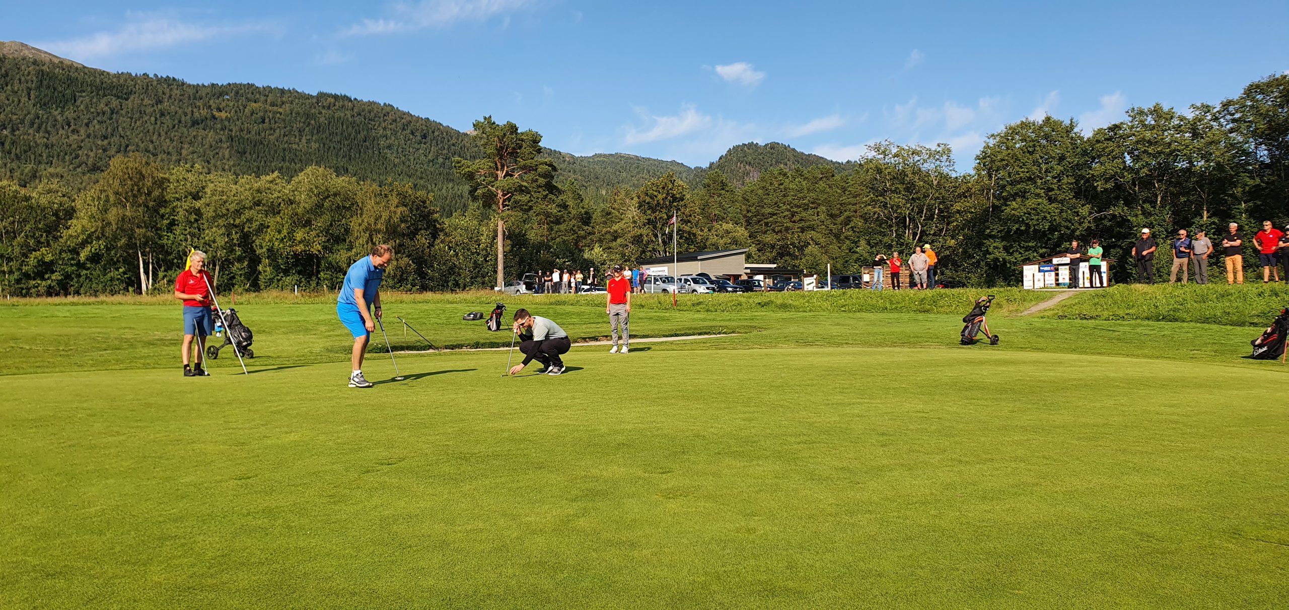 Og her er gjengen kommet til hull 18, der Allan Troelsen putter. Klubbmester Stian Kooyman forbereder sin parputt, mens Geir Garte og Marius Kvande følger med i bakgrunnen.