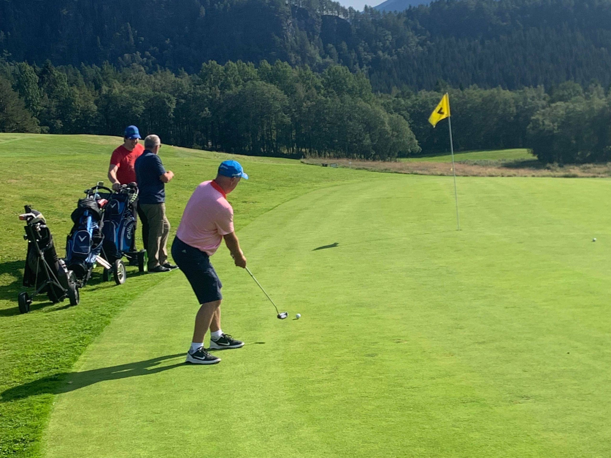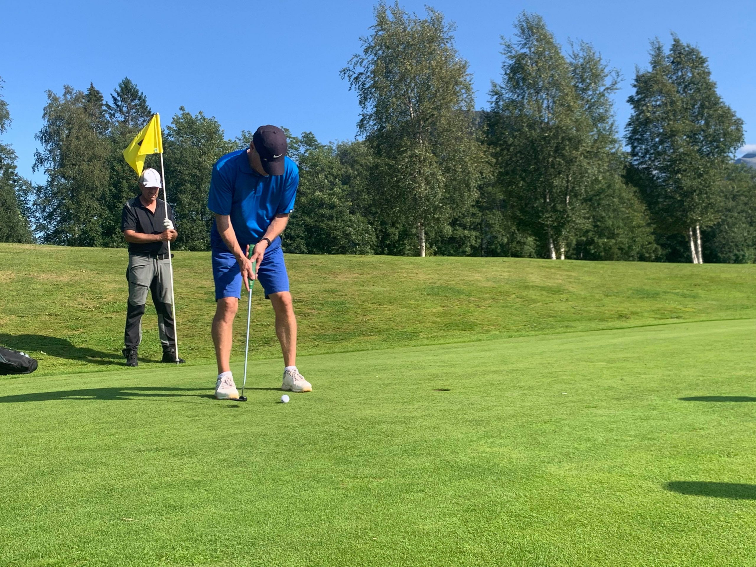 Her er turneringsleder/webredaktør Knut Haugen som forsøker seg på en langputt på hull 16. Forøvrig en særdeles dårlig putt, og medspillerne Tor Helge Taagvold og Arthur Melling virker også (naturlig nok) relativt uinteressert 🙂