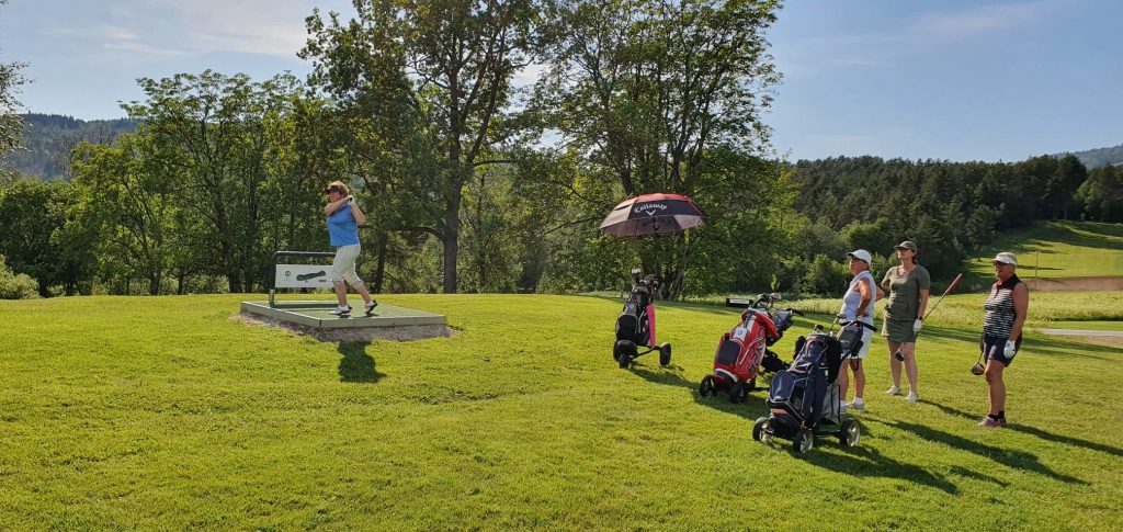 I dameklassen var det mindre tvil om førsteplassen. Laila Eriksen Østbø – som her slår ut på hull 10 – vant med sine sterke 20 poeng foran Malin Røen med 16 poeng.