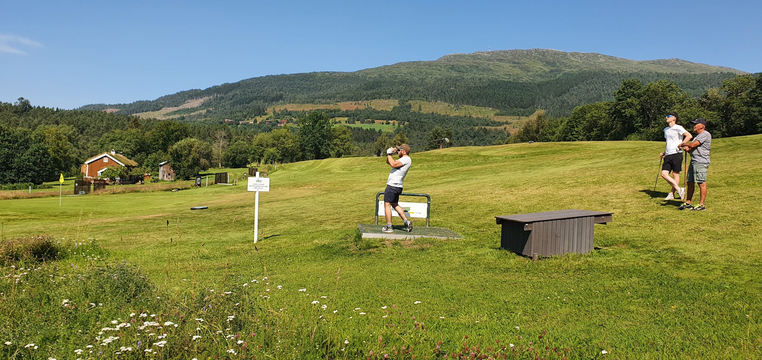 Samtidig med at vi møtte de tre lokale guttene på hull 6, gikk flere andre unge golfere på andre steder på banen. Og på hull 1 startet fire unge gjestespillere fra Sunndal Golfklubb sin runde. Det er nå i sommer daglige besøk på banen vår fra spillere tilhørende Sunndal GK, og det setter vi stor pris på.