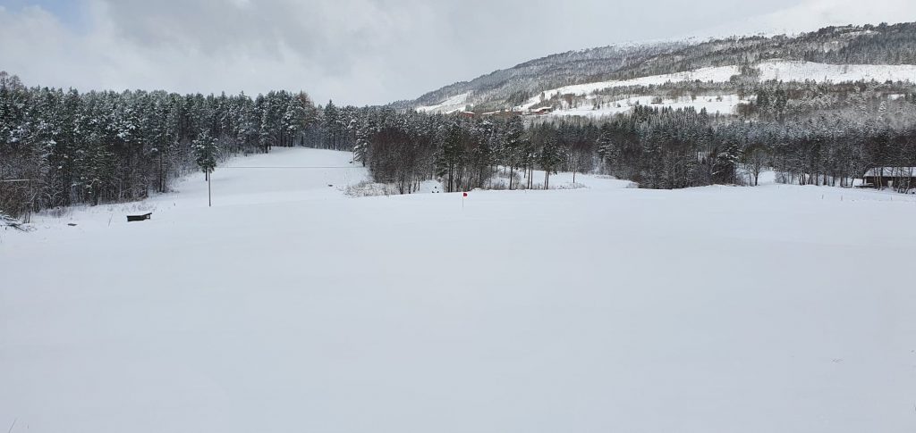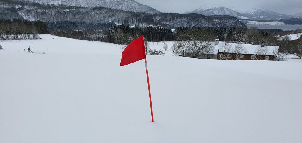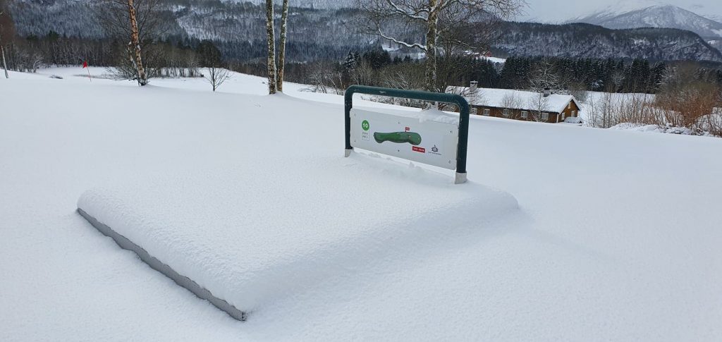 Tidlig i påsken kunne vi som kjent åpne Surnadal Golfpark for spill på vintergreener, og vi har fått muligheten til å lufte golfkøllene utendørs noen dager.  Men i går ettermiddag kom uværet, og 2. påskedag våknet vi til 20 cm. nysnø på golfbanen, og begrepet «vintergreen» fikk plutselig en ny betydning ……